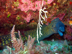 Marc me dépose dans la baie, à l’abri du courant. Après l’expérience du matin et compte tenu de la réputation du canal pour le « gros », je ne fais guère le fier et me colle au récif. J’ai bien indiqué à Marc mon intention de passer la pointe et me laisser emporter par le courant. L’eau est trouble, la visibilité ne dépasse pas les 15 mètres. A peine immergé, un banc de grosses carangues me tourne autour, elles me suivront toute la plongée. Je suis partagé entre l’idée de rejoindre le milieu du canal pour voir le « gros » et celle de rester près du récif pour protéger mes arrières. Alors j’oscille entre les deux au gré de mon courage. La plongée est trop vite terminée. Je remonte avec un goût de trop peu, à refaire au plus vite avec au moins un camarade pour gonfler mon courage.