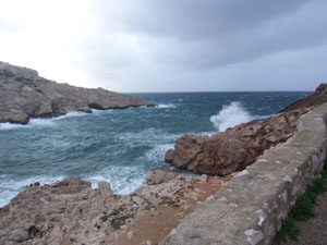Le commandant EUGENE (officier de réserve honoraire) et Frédéric vont vérifier si notre pneumatique le "Barracuda" est bien amarré au sol, sur le glacis du port de Callelongue, car la mer monte, poussée par le Labé. Delà, ils partent reconnaître des blockhaus en ruine parsemés çà et là parmi les blocs rocheux sur les hauts des Goudes, où le vent souffle par moment avec une grande violence. Ces derniers témoins de la Guerre 39-45 et de l’occupation allemande constituent aujourd’hui une curiosité touristique, et également un point de vue imprenable sur les environs.