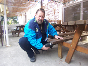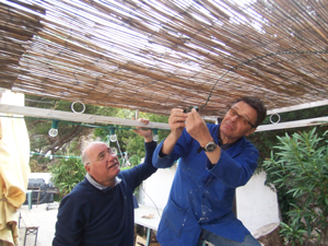 Nous avons commencé par le boulot, Frédéric et Henry en charge de la consolidation des canisses de notre pergola, quand à moi, de mettre des jambes de renfort sous les bancs des tables de la terrasse, Lucien s’occupait de finir les TIV aidé par Guy notre photographe.