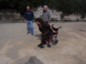 Ouverture du terrain de boule situé juste en face de notre base, montée de Martine et son fauteuil car celle-ci à eu un accident au ski et ne doit pas s’appuyer sur son pied gauche.