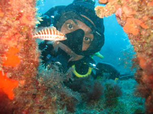 Mon binôme sera Hinde. Elle ne consomme pas trop et a le coup de palme des marathoniens, donc pas de souci. Thierry hésite un peu: courant entrant ou courant sortant? Finalement sur un coup de dés ou après une longue réflexion bien mûrie (nul ne le saura jamais), il prend la très bonne décision de nous jeter sur l’extérieur. Impatient de nous mettre à l’eau, nous nous immergeons dès l’arrêt du moteur sur un fond de 15 mètres.