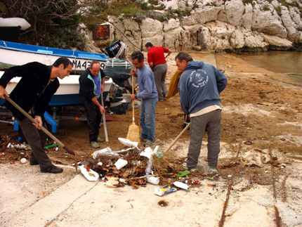 Samedi 6 novembre. Suite à la grève des éboueurs, au vent d’est qui a soufflé une partie de la semaine et de sa renverse, de nombreux macros déchets, ordures et détritus en tout genre, voire un rat mort ; sont venus se déposer sur la plage et le glacis de la calanque de Callelongue. Sous la houlette de Marseille Sports Loisirs Culture, le club nautique, le CIQ et les résidents de la calanque, ont entrepris le nettoyage du site. (Voir photos) Car aujourd’hui, qu’il n’y a plus de cantonnier. Comment faire pour tenir propre ces lieux, qui demain, seront dans le cœur même du parc national des calanques ?.... |