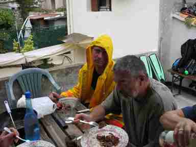 Un Samedi d’été. En ce samedi 14 aout , après une chaleur étouffante de la semaine précédente, nous voici sous la pluie, pour une plongée entre Morses. Comme à l’habitude les préparatifs des bateaux et matériels avant le départ, ont été rocambolesques. Tout d’abord le remplacement et mise en place du filtre décanteur d’essence du "Suscle 2" par notre Lulu national et après de nombreux essais de démarrage, le filtre a été carrément shunté. (voir au prochain épisode ) L’arrivée plus ou moins à l’heure des Morses, (males et femelles ) les préparatifs du matériel personnel, le revêtement de la tenue, bref vous voyez la scène!. Bref nous voici parti sous la pluie pour les moyades. Nous avons pu découvrir le premier point d’ancrage (Photo ci jointe ) Martine accompagné de Frédéric, notre colonel et du grand Philippe (comme le nomme Martine) ont vu paraîit-il: 3 saint-pierre de face de profil et de dos, (il est vrai que le lendemain sera le 15 août l’Assomption ) une murène monumentale, sars, daurades, dentis, etc..( voire un aileron de requin blanc? ). Notre retour toujours sous la pluie, avec de nombreuses discutions sur la plongée et à vitesse réduite avoisinant les 5 à 6 nœuds et pourtant c’était Lulu qui pilotait. Cette nouvelle aventure c’est terminée comme à l’habitude par de longues discutions autour d’un apéritif et d’un repas barbecue, pris en commun et toujours sous la pluie . Le ciré était de rigueur. (photo jointe ) Jean-Claude Eugène |