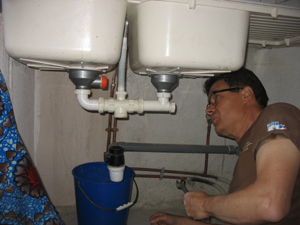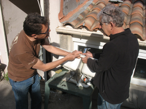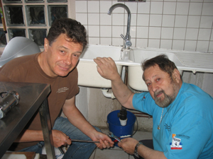 Par exemple, le démontage du « corps du délit » est à l’origine d’une réunion d’état-major, menée sur place en urgence, aboutissant à une résolution ferme et sans appel : il faut desceller l’évier. La présence du mur, les parois rapprochées des deux bacs et l’encombrement du peu d’espace disponible par deux tiges filetées ne permettent pas l’usage d’une clef de démontage des écrous de fixation du socle du robinet en question.